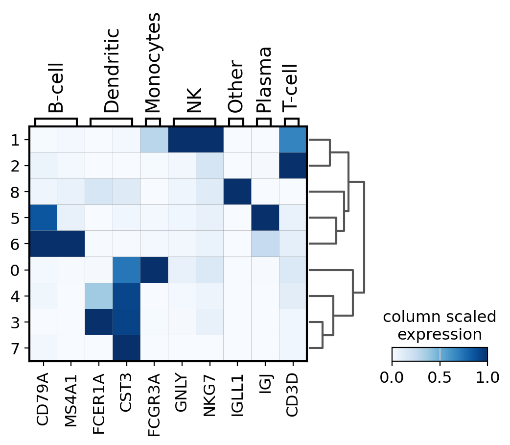 A simple way to visualize the expression of genes is with a matrix plot. This is a heatmap of the mean expression values per gene grouped by categories. This type plot basically shows the same information as the color in the dotplots.