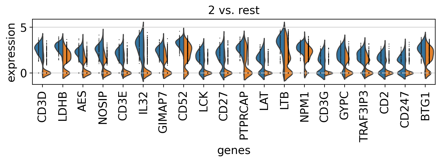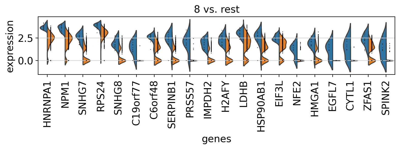 In scanpy, is very easy to compare marker genes using split violin plots for all groups at once.