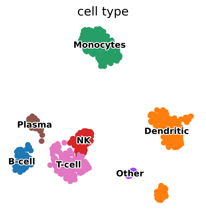 pbmc.obs["cell type"] = pbmc.obs["clusters"].map(cluster2annotation).astype("category")