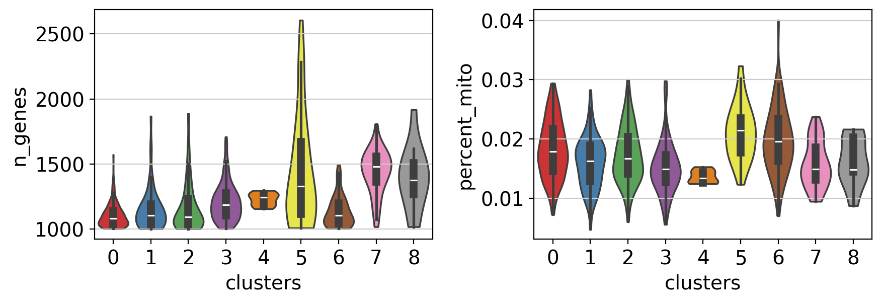 Note Violin plots can also be used to plot any numerical value stored in .obs. For example, here violin plots are used to compare the number of genes and the percentage of mitochondrial genes between the different clusters.