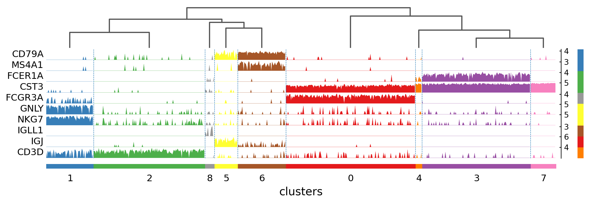 Also, it is also useful to add a dendrogram to the graph to bring together similar clusters. The hierarchical clustering is computed automatically using the correlation of the PCA components between the clusters.